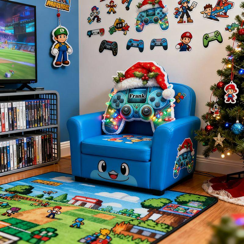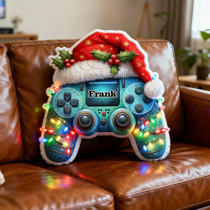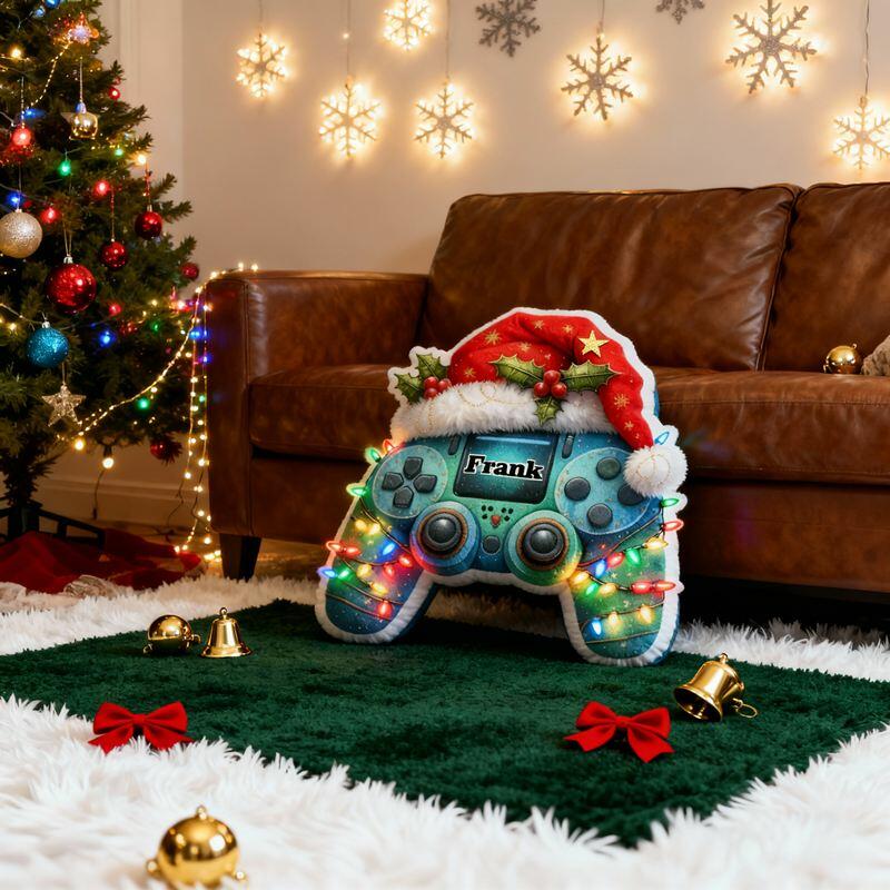Cuscino personalizzato a forma di cartone animato con disegno del gamepad con cappello da Babbo Natale Regalo creativo per gli amanti dei videogiochi